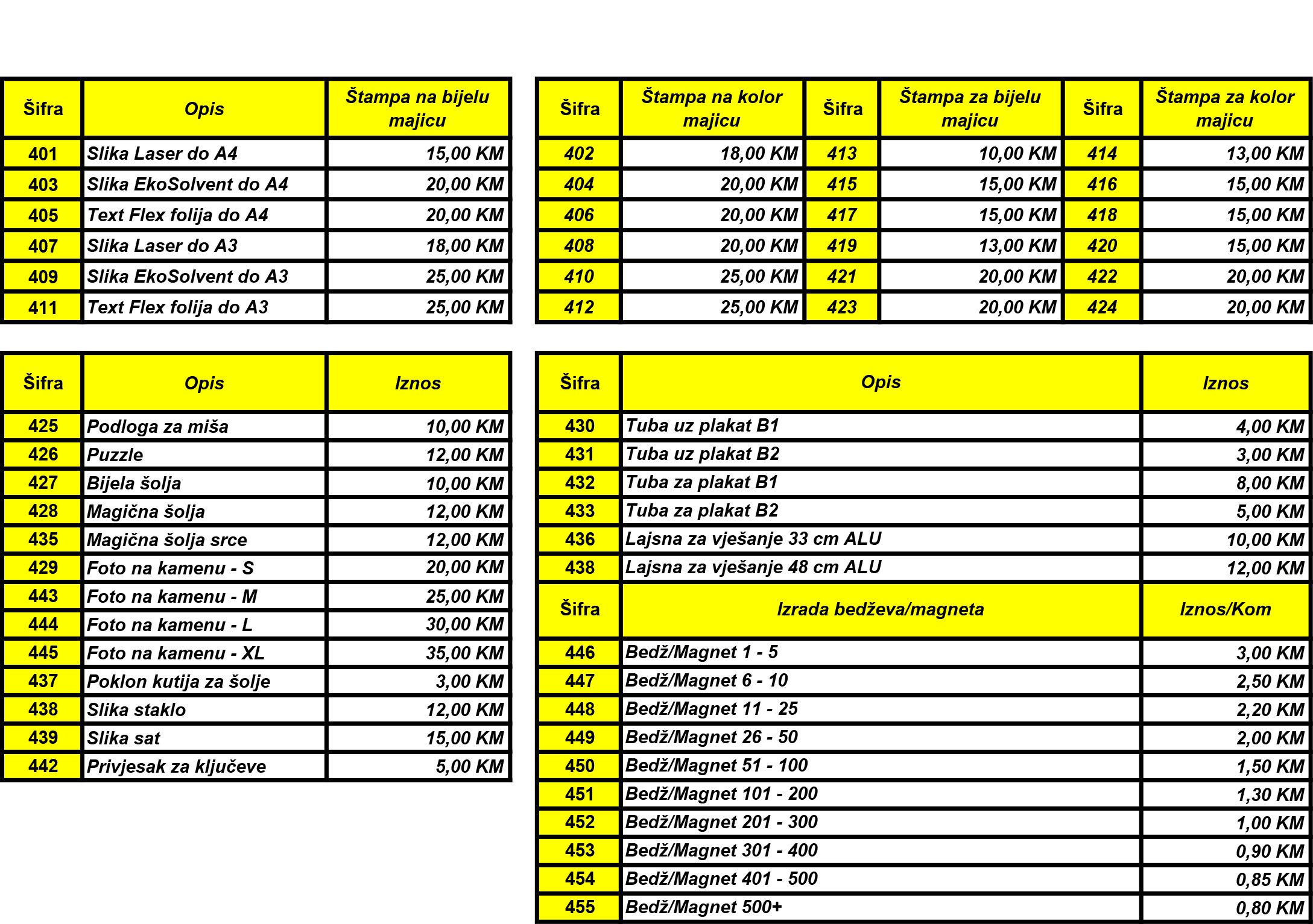 Kopiranje i printanje C/B i kolor, kopiranje velikih formata C/B i kolor do 914 mm širine, plotanje crteža i plakata C/B i kolor, skeniranje do 914 mm širine, sve vrste uvezivanja, plastificiranje do 1 m širine, presnimavanje video materijala na DVD, izrada fotografija, izrada suvenira (šolja, slagalica, kačketa, upaljača), print na majice...i još mnogo toga!